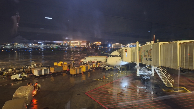 비행기 연결하는 브릿지 없음. 비행기까지 데려다주는 버스 없음.