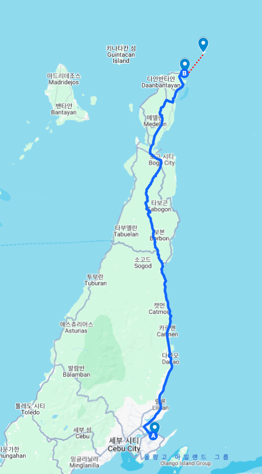 지도상의 A지점이 세부의 막탄섬에 있는 공항. B지점이 마야항구.