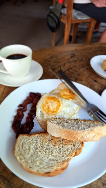 커피는 맥스웰 가루커피 맛이고, 베이컨,계란후라이,빵.. 뭐 이런 식이야.